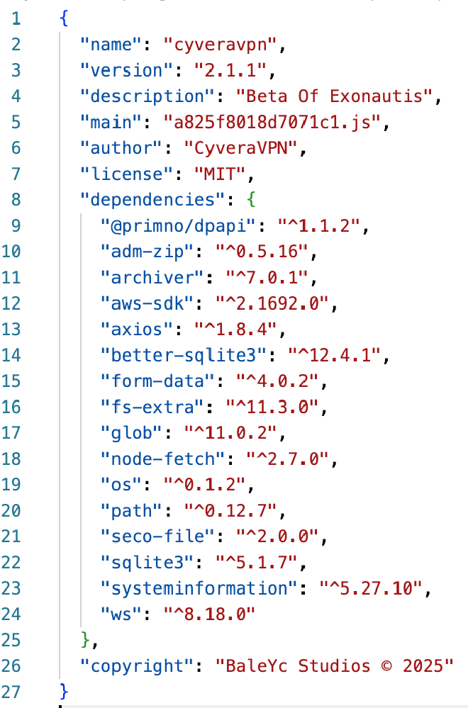 Two things jump out immediately. First, the description says “Beta Of Exonautis” — that’s the lure. Second, the dependency list in this same file reads like a stealer shopping list: @primno/dpapi (Windows credential decryption), better-sqlite3 and sqlite3 (browser database reads), aws-sdk (AWS credential theft), seco-file (Exodus wallet extraction), archiver and adm-zip (data packaging for exfil), ws (WebSocket, used for Chrome DevTools Protocol), systeminformation (system fingerprinting).