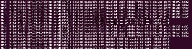 The provided auth.log shows that 65.2.161.68 is the IP address that performed the bruteforce attack.