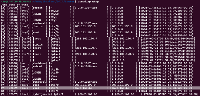 Using tools like utmpdump, we can dump the wtmp files and see all the details.