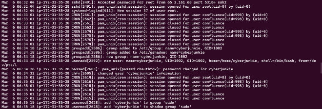 Right after the attacker login manually, the attacker created a new user named cyberjunkie and give a high privilege to it by adding the user to the sudo group