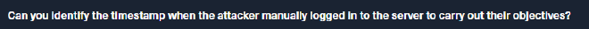 Here are the first manual login attempt by the attacker. Take this part and relate it with the wtmp file given to get the exact timestamp the attacker logged in as root.