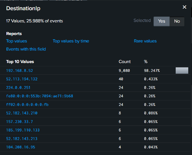 Here, the attacker is trying to guess the correct credentials for user admin. From Splunk itself, notice that IP address 192.168.8.52 has the most event for destination IP, which indicates that IP was being attacked via brute force.
