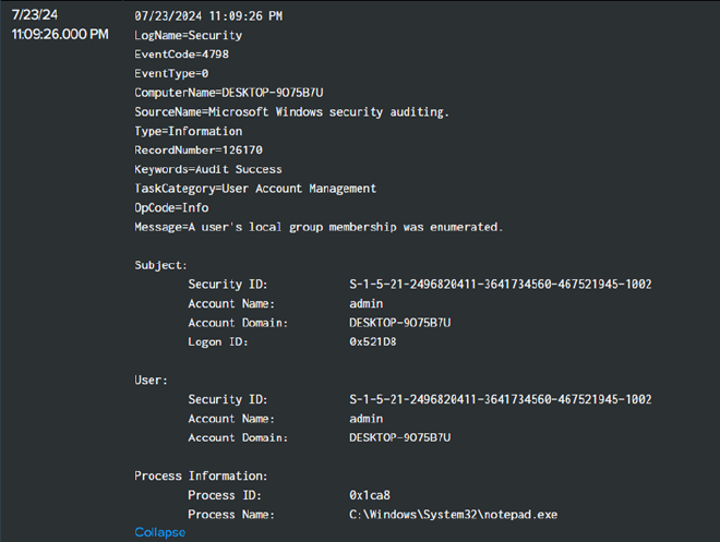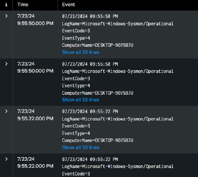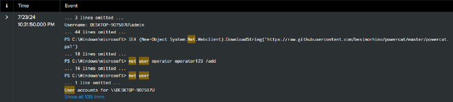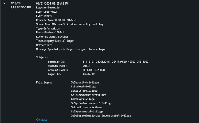 Filtering out event ID 4672 reveals all successful logins. Identify the timestamp close to when the script finished running, which is two minutes later when the attacker manually logged in as user admin at 7/23/24 9:55:52.000 PM.