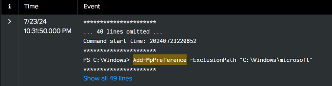 Filter out the keyword Add-MpPreference. The displayed command is the command to exclude the path from being detected by Micorsoft Defender.