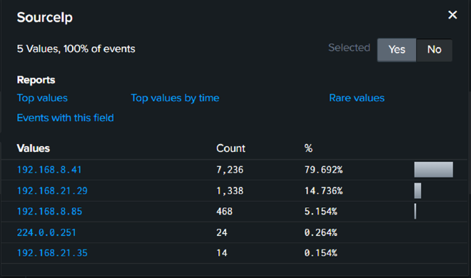 If there is a destination, there must be a source. By examining the source IP, it is evident that 192.168.8.41 has the most events. This IP address is likely the attacker’s. Additionally, the attacker most likely used a script in an attempt to obtain the correct credentials for the victim’s IP address.