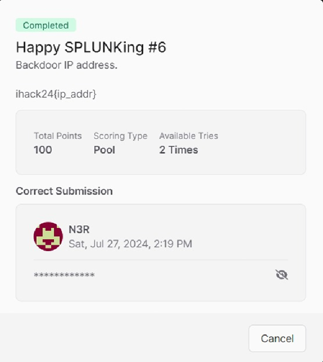 In the same timestamp as the previous challenge, there was a powershell command excuted with a tool called powercat (basically a ncat or nc for windows) and an IP address act as a backdoor.